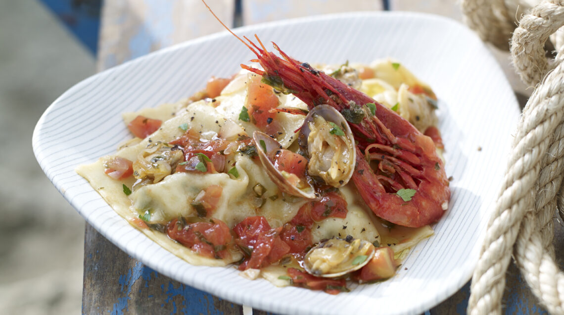 Un trionfo di pesce e molluschi per questa pasta ripiena fatta in casa. Il sughetto di pomodoro è fresco