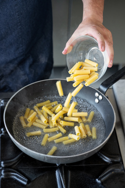 Versate i rigatoni in padella, unite 2 dita di acqua leggermente salata e l'olio e portate la pasta a cottura mescolando a fuoco basso e aggiungendo altra acqua solo se necessario.