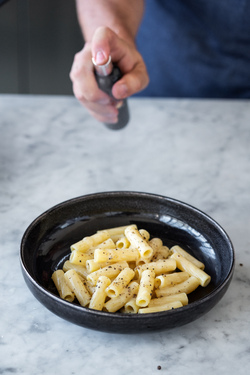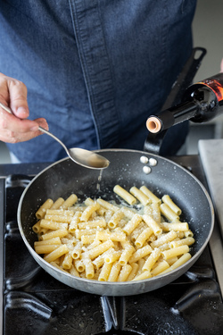 Intanto pestate i tre tipi di pepe: metteteli in un panno, chiudetelo a fagotto e pestate con il pestacarne. Quando i rigatoni saranno morbidi ma ancora al dente, alzate il fuoco e saltateli aggiungendo il cacio a manciatine, i pepi e 1 cucchiaio d'aceto.