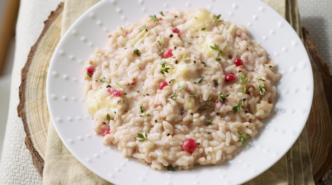 2) Unite un mestolo di brodo bollente per volta e portate il riso a cottura, mescolando di tanto in tanto. A metà cottura unite il ribes, sgranato e sciacquato, e le foglioline di un rametto di timo.