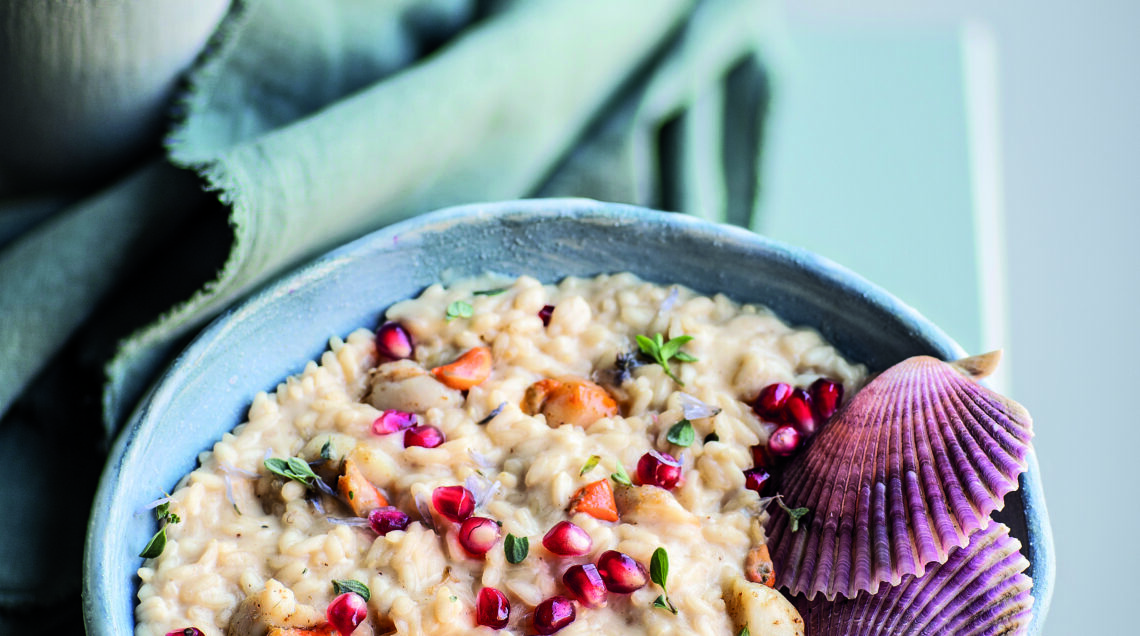 3) Fuori dal fuoco, mescolate al risotto i chicchi sgranati della melagrana e i canestrelli. Profumate con qualche fogliolina di maggiorana e servite decorando i piatti con qualche guscio pulito e tuffato per qualche minuto in acqua bollente.