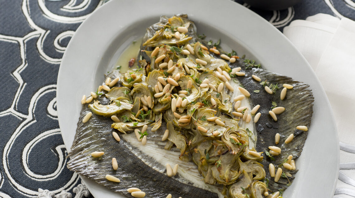 2) Sciogliete il burro in una padella antiaderente, unite i pinoli e dopo 2-3 minuti anche i carciofi scolati e asciugati. Regolate di sale e cuoceteli coperti per 7-8 minuti. Portate a ebollizione in una grossa padella 4 dita di acqua, unite una presa di sale e scottate i rombi, uno alla volta, per 5 minuti. Scolateli e lasciateli intiepidire.