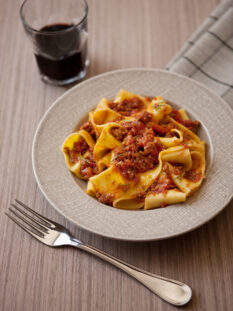 Il ragù è una preparazione tipica della gastronomia italiana. Si tratta di un condimento a base di pomodoro, carne o pesce che deve essere cotto a lungo e a fuoco molto basso. Fra gli altri ingredienti base del ragù ci sono la cipolla, il sedano e il prezzemolo che devono essere prima tagliati finemente a coltello e poi soffritti in olio extravergine d’oliva. Utilizzato per condire la pasta di vari formati sia fresca che secca, il ragù può essere conservato per diversi giorni in frigorifero oppure si può congelare. In Italia esistono tre diversi tipi i ragù: il ragù alla bolognese, utilizzato per condire tagliatelle, lasagne e cannelloni, il ragù napoletano, che deve essere cotto almeno per sei ore consecutive a fuoco lentissimo e il ragù alla potentina, realizzato con carne di maiale, manzo e pollame.