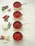 4) Passa tutto al passaverdure, poi fai restringere a fuoco moderato per 15 minuti. Trasferisci il sugo in 4 vasi da conserva da 250 ml e copri con un velo d'olio. Chiudi i vasi e sterilizzali per un'ora mediante bollitura.