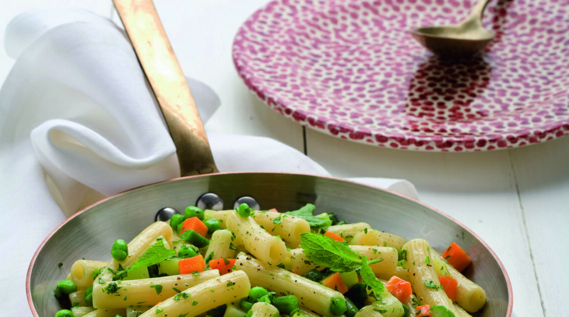 4) Cuoci la pasta in abbondante acqua salata, scolala al dente e trasferiscila nella padella con il sugo di ortaggi. Aggiungi ancora un filo di brodo, cospargi con l'erba cipollina tagliuzzata fine e qualche foglia di menta spezzettata e falla saltare per mezzo minuto a fuoco vivace.