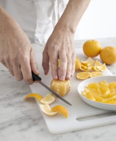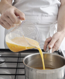 Versate il succo in una casseruola con 120 ml di brodo e fate ridurre della metà. Unite 150 ml di panna e 2 cucchiai di Grand Marnier e scaldate. Spegnete e incorporate 60 g di burro freddo. Salate, pepate e completate con la scorza grattugiata.
