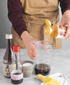 Mescolate la salsa di soia, il sake e il mirin nel bicchiere di un frullatore a immersione.