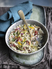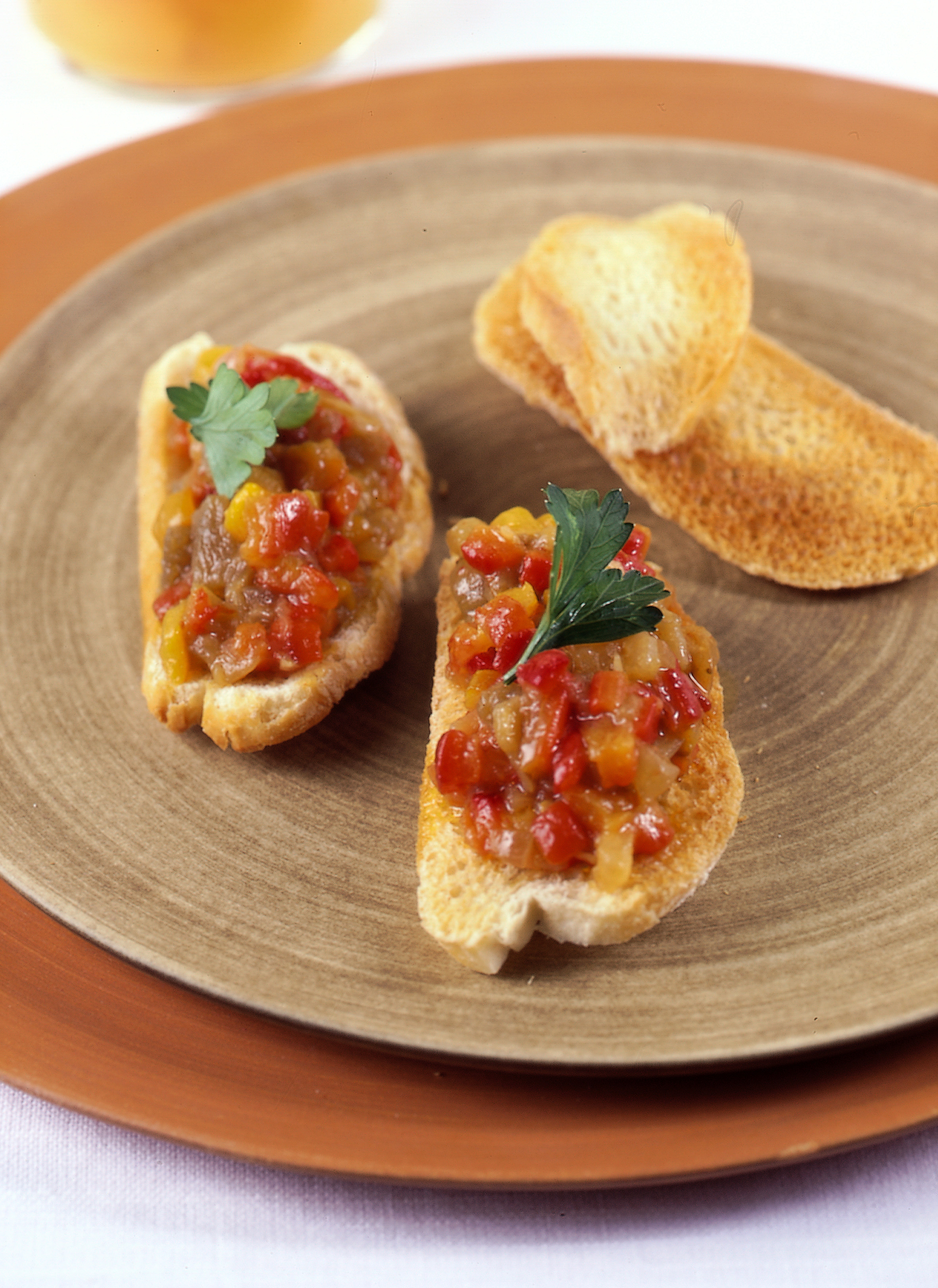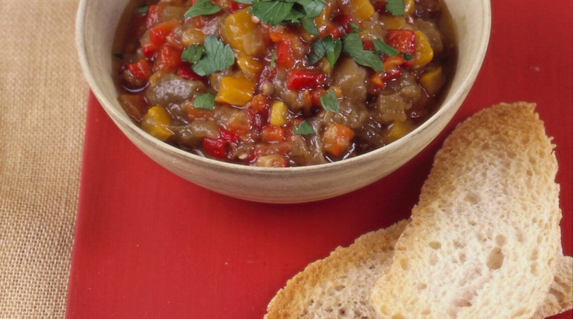 3) Prendi i peperoni, togli la buccia e i semi e taglia la polpa in piccoli dadini. Prendi la polpa di melanzane e tagliala a cubetti. In una padella antiaderente con un po’ di olio, fai soffriggere aglio e cipolla tritati, aggiungi le verdure e fai cuocere per 20 minuti. Lascia che il sugo delle verdure evapori pian piano, aggiungi sale e pepe a piacere e un po’ di succo di limone. Lascia raffreddare. Prendi una ciotola e versa le verdure con un po’ di prezzemolo tritato fresco.