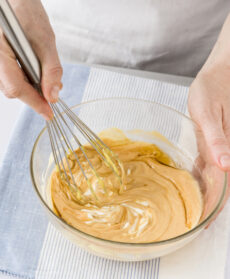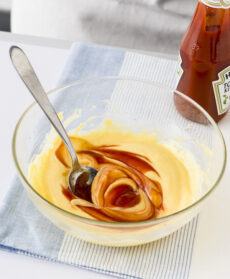 Disponete in una ciotola la maionese e unite 3 cucchiai di ketchup mescolando delicatamente con un cucchiaio in modo da non far sgonfiare la salsa.