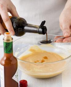Sempre mescolando lentamente, aggiungete 1 cucchiaino di salsa Worcestershire e il Cognac facendoli colare a filo nel composto, e poi amalgamate 6 gocce di tabasco, una alla volta.