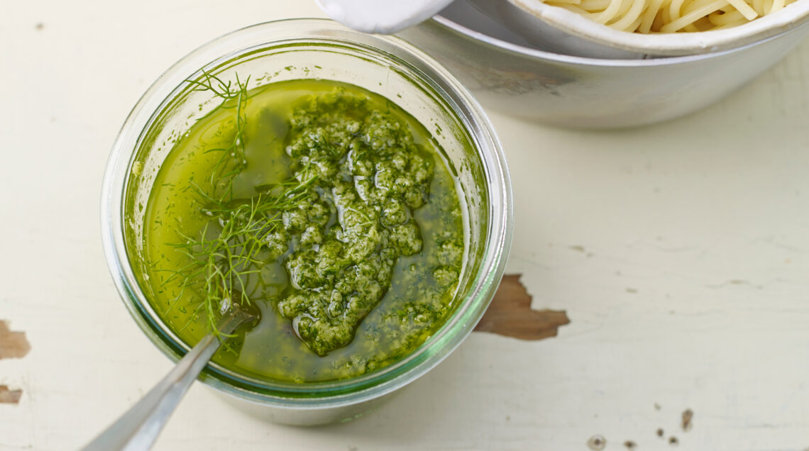 3 Versate a filo 1,5 dl di olio, contemporaneamente frullando, fino a ottenere una crema omogenea. Se non lo usate subito (la dose - circa 200 g - è sufficiente per una pasta per 4-6 persone) o se avanza, versate il pesto in un vasetto e coprite la superficie con un abbondante velo d'olio. Chiudete e conservate in frigo, dove si mantienete bene 1-2 settimane.