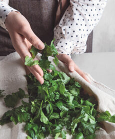 Mondate 1 mazzetto di prezzemolo e 1 di coriandolo, quindi lavate e asciugate le foglie.