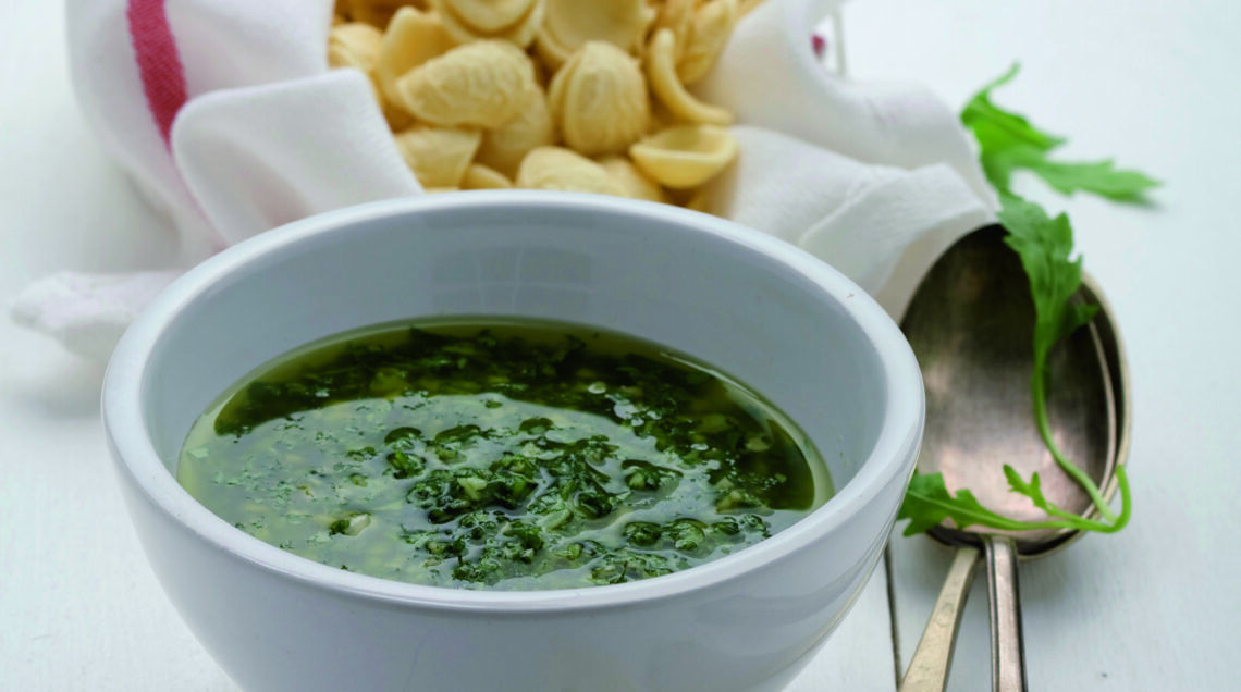 Una variante particolare della tipica salsa genovese a base di basilico, questo pesto sfrutta le note aromatiche della rucola che mescola con pecorino toscano, ingentilisce con mandorle e aggiunge uno sprizzo agrumato con la scorza di limone. Una volta preparata, il pesto chiuso in un vasetto coperto a filo con olio dura in frigo per 2 giorni. È anche possibile congelarlo dopo averlo riposto in contenitore ermetico: si mantiene per 1 mese.