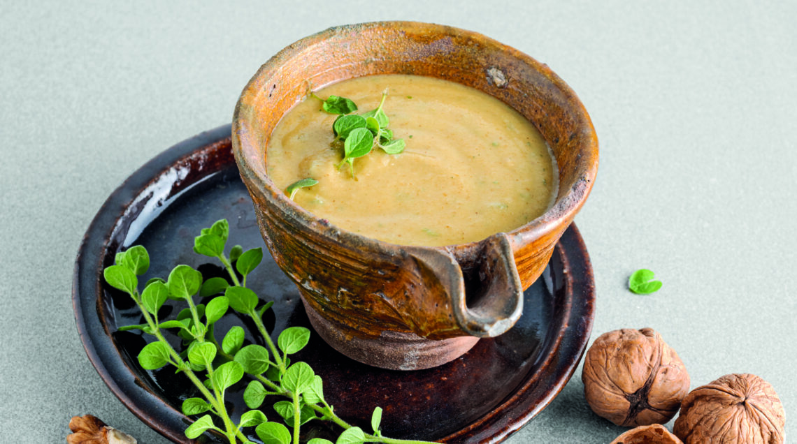 Una salsa caratterizzata dall'aroma dell'aglio e dalla consistenza delle noci. Profuma di maggiorana e accompagna volentieri pesci arrosto, verdure bollite, uova sode e crostini