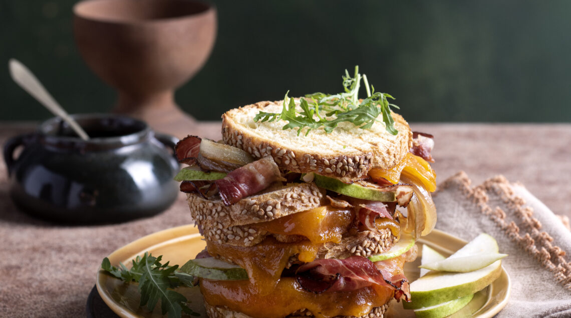 3) Inserite la teglia a metà del forno con il grill acceso e fate fondere il formaggio. Quando quest'ultimo comincia a colare togliete la teglia dal forno e componete i sandwich alternando le fette di pane con il formaggio, la pancetta, la cipolla, le fettine di pera e qualche foglia di rucola. Chiudete con le fette di pane tostate senza formaggio e servite subito.
