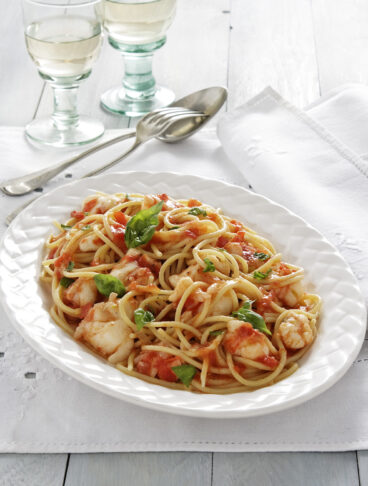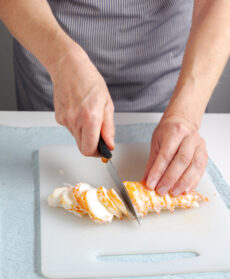 Bollite 1 aragosta, fatela raffreddare ed estraete la polpa come spiegato nella pagina precedente; tagliate la polpa a fette di circa 1/2 cm