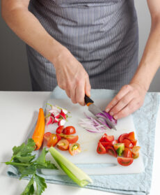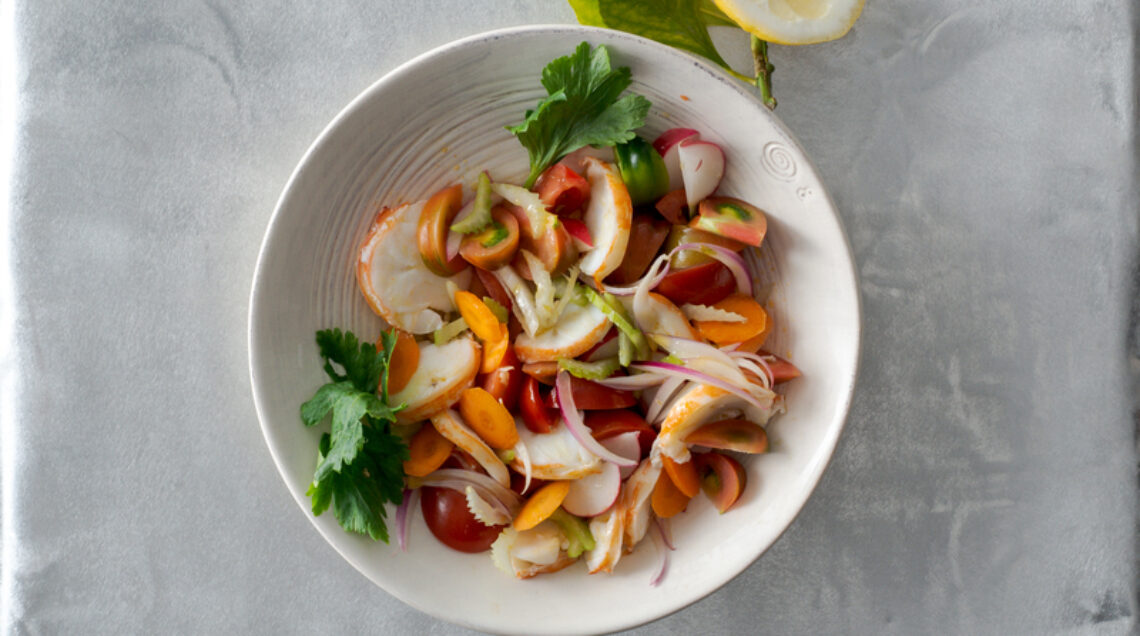 Lavate 4 pomodori sardi e tagliateli a spicchietti. Raschiate e spuntate 2 carote novelle e affettatele insieme a 2 coste di sedano. Sbucciate 1 cipolla rossa e tagliatela a fettine sottili. Riunite aragosta e verdure in un vassoio. Versate in un vasetto 4-5 cucchiai d'olio, 1 cucchiaio di aceto bianco, un pizzico di peperoncino e sale; chiudete e agitate. Condite crostacei e ortaggi con la vinaigrette ottenuta e profumate con prezzemolo.