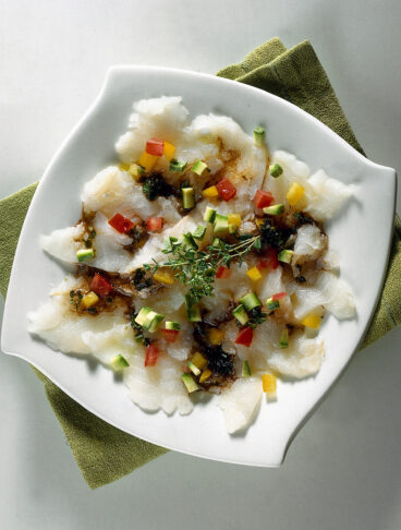Un secondo di pesce al forno, accompagnato da una profumata salsa alla frutta secca