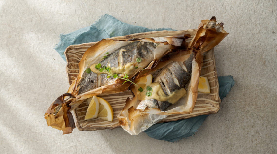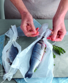 Adagiate ognuno su un foglio di carta da forno e incideteli con tre tagli in diagonale. Richiudete la carta parzialmente (in modo che la parte superiore dei pesci resti scoperta) e fissatela con spago da cucina. Condite in superficie con olio, sale e pepe e infornate a 200° per 10 minuti. Servite con spicchi di limone e l'agliata alle noci.