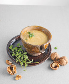 Sbucciate 6 spicchi d'aglio, privateli del germoglio interno e metteteli nel bicchiere del frullatore con 12 noci, 1 cucchiaino di Armagnac o brandy, un pizzico di sale e 1/2 dl di olio. Frullate fino a ottenere una pasta e poi unite 1/2 dl abbondante di olio a filo per montare la salsa. Aggiungete poca maggiorana e frullate ancora per pochi istanti. Servite con i branzini.