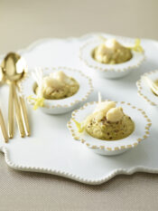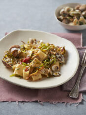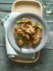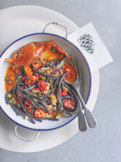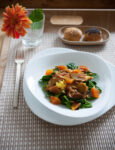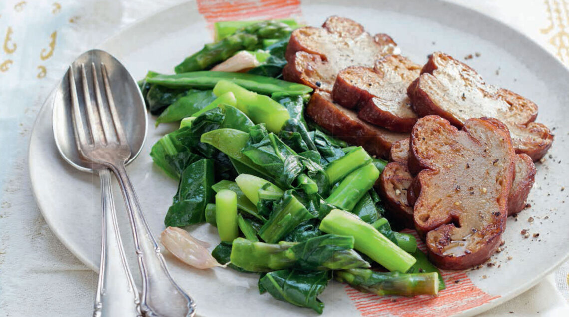 3) Pulisci e lava le verdure. Sbollenta gli asparagi, tagliati a tocchetti, con le taccole in acqua bollente per 3 minuti, poi scolali. Salta le bietoline e spezzetta in una padella con un filo d'olio e un pizzico di sale. Unisci asparagi e taccole e condisci con il succo del limone. Rosola le fette di seitan in una padella con poco olio e servi nei piatti con le verdure e una manciata di pepe.