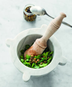 Nel frattempo preparate la salsa di prezzemolo. Inzuppate 2/3 del pane nel latte e 1/3 nell'aceto. Tritate finemente le foglie di prezzemolo con un pizzico di sale in un mortaio. Poi aggiungete il pane, le acciughe, i capperi e tritate il tutto.