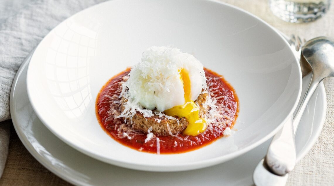 Uova al pomodoro con pane integrale e pecorino