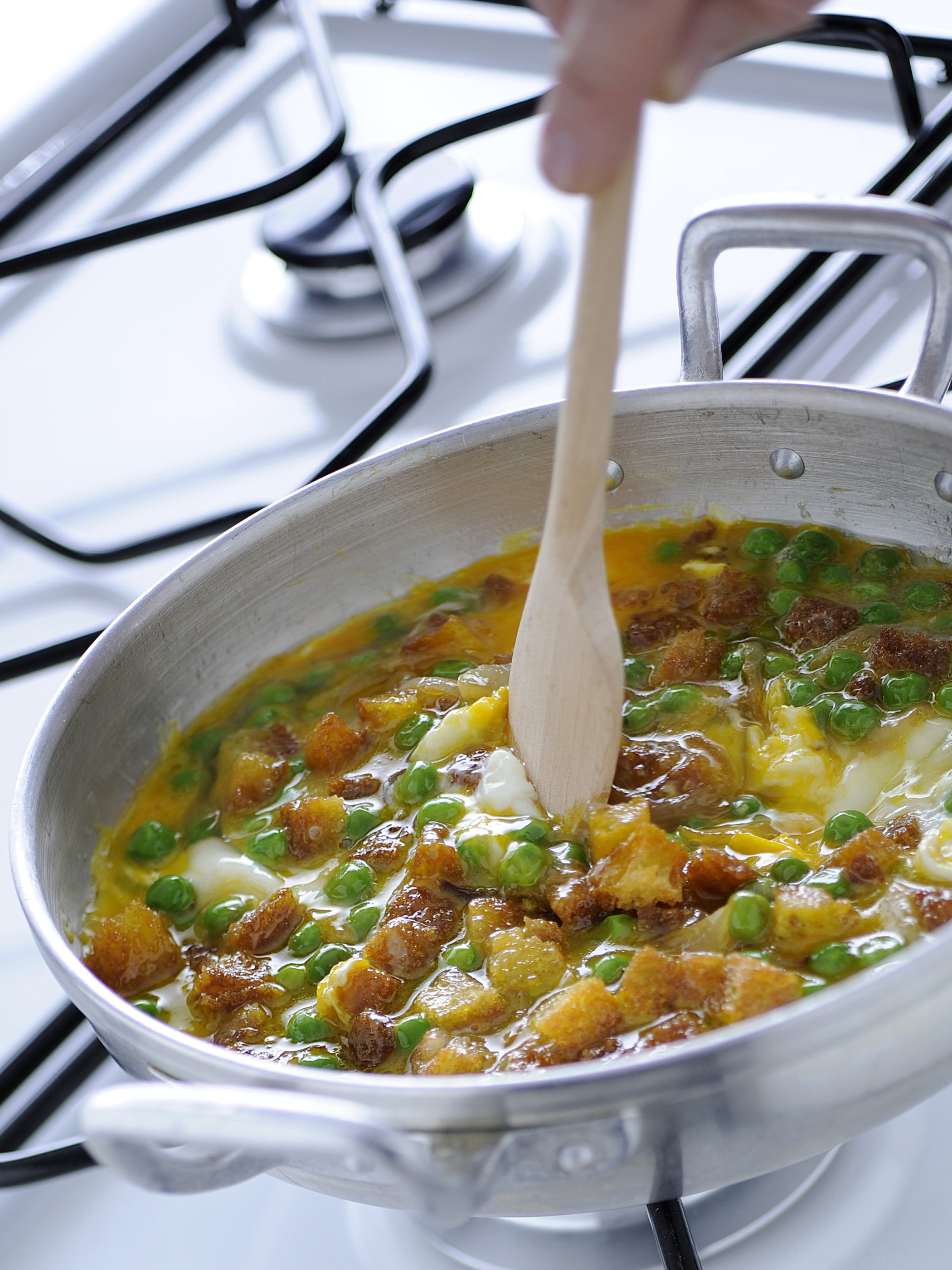 3) Sbatti le uova con una macinata di pepe e un pizzico di sale, quindi versa il composto in una padella antiaderente in cui avrai già fatto sciogliere il burro rimasto. Aggiungi anche i piselli e i crostini di pane. Fai saltare sul fuoco e mescola finché il composto inizia a rapprendersi. Ora le tue uova arriminate con pane e piselli sono pronte per essere mangiate, ben calde.