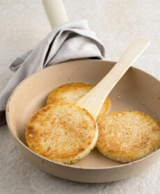 Ricavate dal pane quattro fette di 2 cm di spessore 4 dischi di 10 cm di diametro con un tagliapasta. Fate rosolare le fette di bacon in una padella, in modo che risulti croccante e sgocciolatele. Nella stessa padella tostate i dischi di pane su entrambi i lati, così che assorbano il grasso lasciato dal bacon. Tenete in caldo pane e bacon.