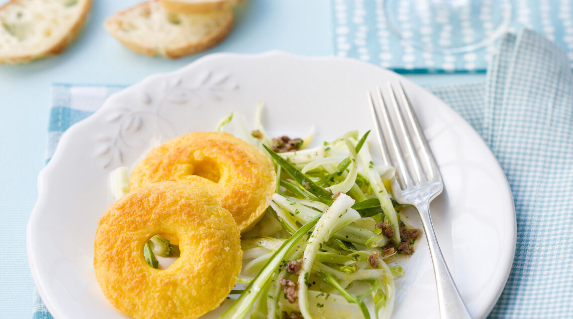 3) A fine cottura sformate 2 ciambelline su ogni piatto. Scola le puntarelle, condiscile con la salsa all'acciuga e distribuiscile sui piatti. Le ciambelline al pecorino con insalata di puntarelle sono pronte!
