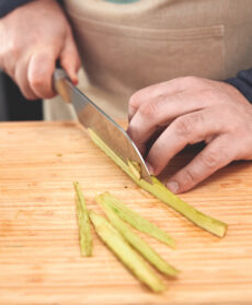 Tagliate a listarelle i gambi di carciofo preparati e metteteli da parte.