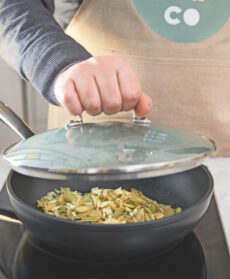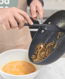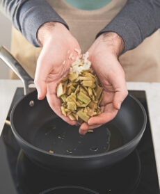 Tritate la cipolla, mescolatela ai carciofi e versate il mix in una padella antiaderente.