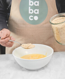 Nel frattempo, sgusciate e sbattete con una forchetta le uova in una ciotola per renderle spumose. Aggiungete il lievito in scaglie o il formaggio, sale e pepe.