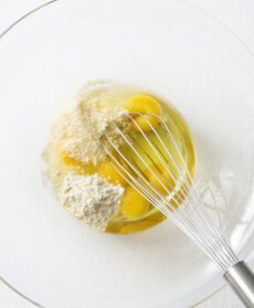 Rompete le uova in una ciotola, unite la farina setacciata, il parmigiano, una presa di sale e l'aceto e sbattete gli ingredienti con una frusta o una forchetta.