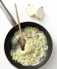 Sbucciate le cipolle, tagliatele a fettine molto sottili e fatele stufare a fiamma bassa in una padella antiaderente con il burro e 3 cucchiai di olio finché saranno morbide.
