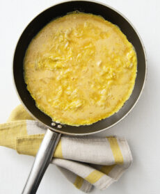 Unite la miscela di uova, mescolate brevemente per distribuire le cipolle e lasciate rapprendere la frittata. Poi giratela con l'aiuto di un coperchio e proseguite la cottura per 2-3 minuti. Servitela con una macinata di pepe.