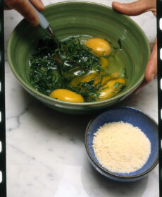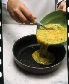 Sgusciate le uova in una terrina. Aggiungete un pizzico di sale e verdure ed erbe aromatiche a piacere. Mescolate il composto con una forchetta facendo attenzione a non sbattere troppo le uova.
