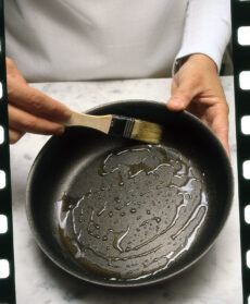Versate l'olio di oliva in una teglia antiaderente di 22-24 cm di diametro, spennellate bene il fondo e i bordi, in questo modo la preparazione non si attaccherà al recipiente.