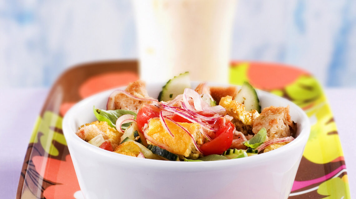 2) Taglia il pane a tocchetti e spruzzalo con 3-4 cucchiai d'aceto. Lava anche i pomodorini e tagliali a spicchietti, sbuccia la cipolla e affettala fine, lava il cetriolo, asporta delle striscioline di buccia con un rigalimoni e affettalo sottile, taglia a dadi la frittata fredda, poi mescola tutti gli ingredienti preparati al pane.
