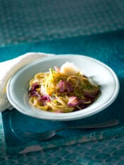 3) Rigira la frittata soffiata su un nuovo foglio di carta da forno ed elimina quella utilizzata per la cottura. Guarnisci la frittata ancora calda con gli asparagi lessati, ricopri con le fettine di speck e le foglie di basilico, lavate e asciugate; spolverizza con il parmigiano reggiano. Arrotola la frittata avvolta nella carta e chiudila a caramella. Lasciala riposare al caldo per 10 minuti. Quindi tagliala a fette spesse 3 cm circa e servi il rotolo di frittata soffiata con lo speck.