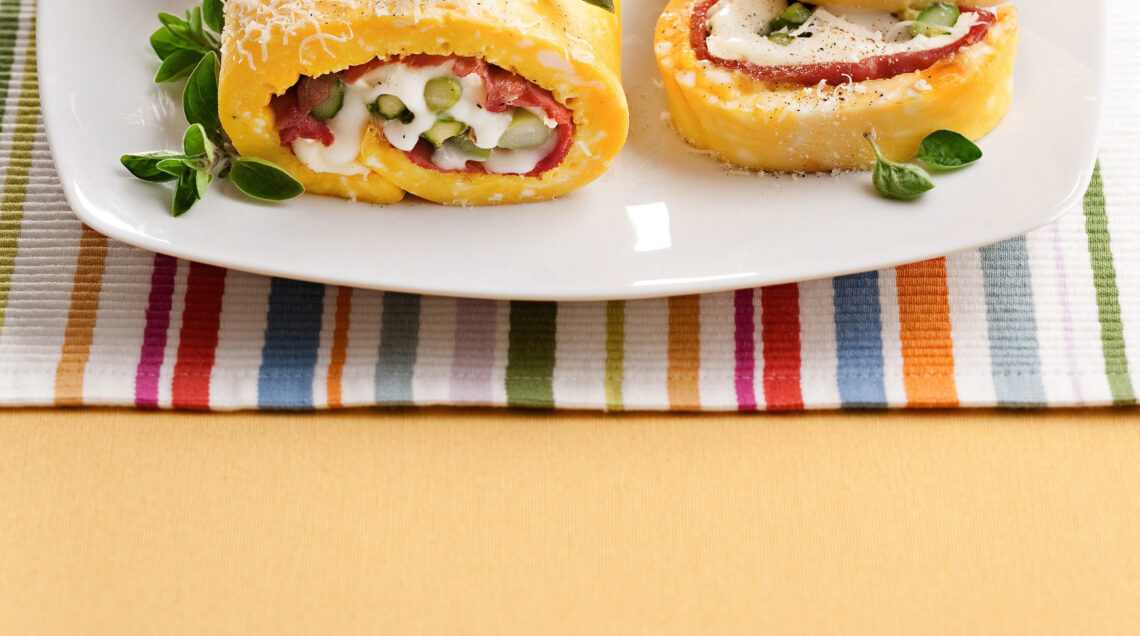 3) Sfornate la frittata e coprila con la bresaola, il brie a fettine, metà del parmigiano e gli asparagi a tocchetti (tranne 2 o 3 per la guarnizione finale). Cospargi con un po' di timo e maggiorana e arrotola la frittata piuttosto stretta.