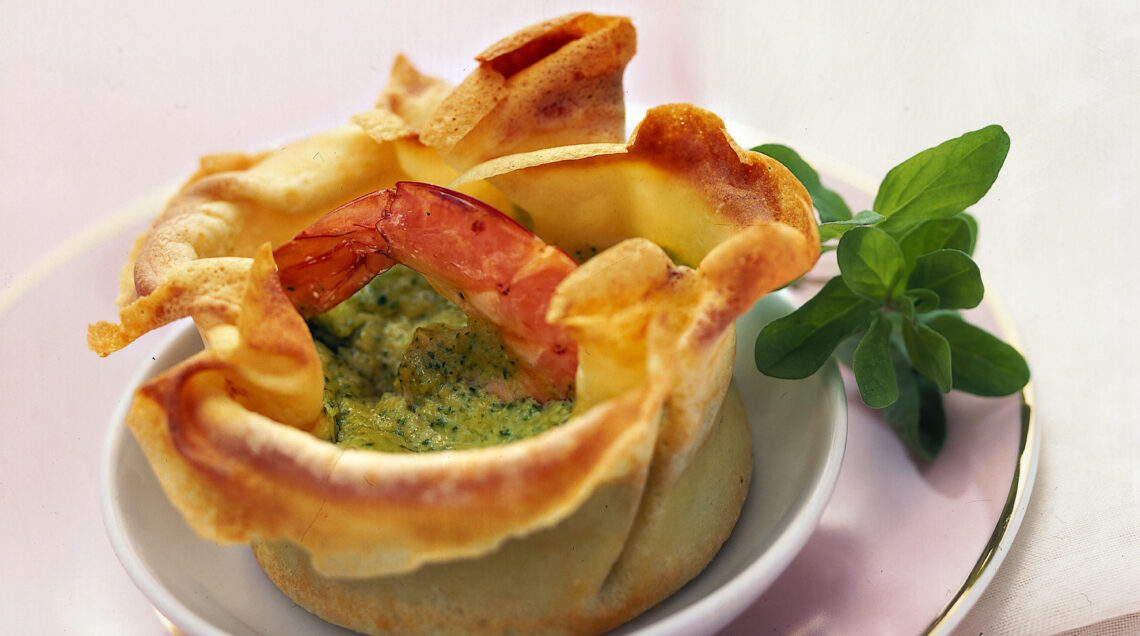 4 Preparate nello stesso modo le altre crepes, fino a esaurire la pastella. Riempite i cestini con il composto di zucchine, distribuitevi le code di gamberi e cuocete in forno a 180° per 15 minuti.