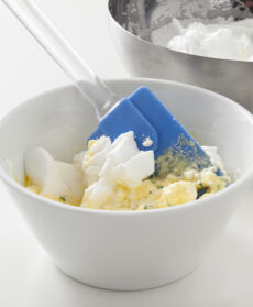 Montate gli albumi con un pizzico di sale e amalgamateli delicatamente al composto di tuorli, mescolando con la spatola dal basso verso l'alto per non smontarli. Sciogliete il burro nella padella e versate il composto di uova. Cuocete su fiamma bassa per 3-4 minuti.