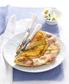 Mettete sopra le uova il prosciutto e le lamelle di formaggio. Quando la parte a contatto con il recipiente sarà dorata, sollevatene metà, aiutandovi con una spatola, e ripiegatela delicatamente sul ripieno. Proseguite la cottura per qualche minuto, per dare al ripieno il tempo di scaldarsi. Preparate allo stesso modo altre 3 omelette. Servite caldo.