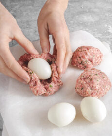Impastate la salsiccia sgranata, la carne di maiale, la senape, le erbe miste tritate, sale, pepe e noce moscata. Dividete il composto in 8 parti uguali e appiattitele con il palmo della mano. Fate rassodare 8 uova, fatele raffreddare. Sgusciatele, cospargetele di farina, sistematele al centro delle 8 schiacciatine di composto e avvolgetele. Passatele in un piatto pieno di farina.