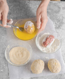 Un piatto di tradizione anglosassone preparato con uova di gallina o di quaglia e carne di maiale. Impanate possono essere cotte in padella o fritte. Noi abbiamo scelto la doppia panatura per un morso più croccante. Sono un ghiotto antipasto o un robusto secondo, doppiamente proteico.