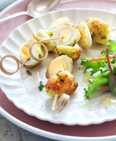 Taglia a metà le ovette e infilale su lunghi spiedini di legno. Servi gli spiedini di uova di quaglia fritte con la salsa di carote e un'insalatina.