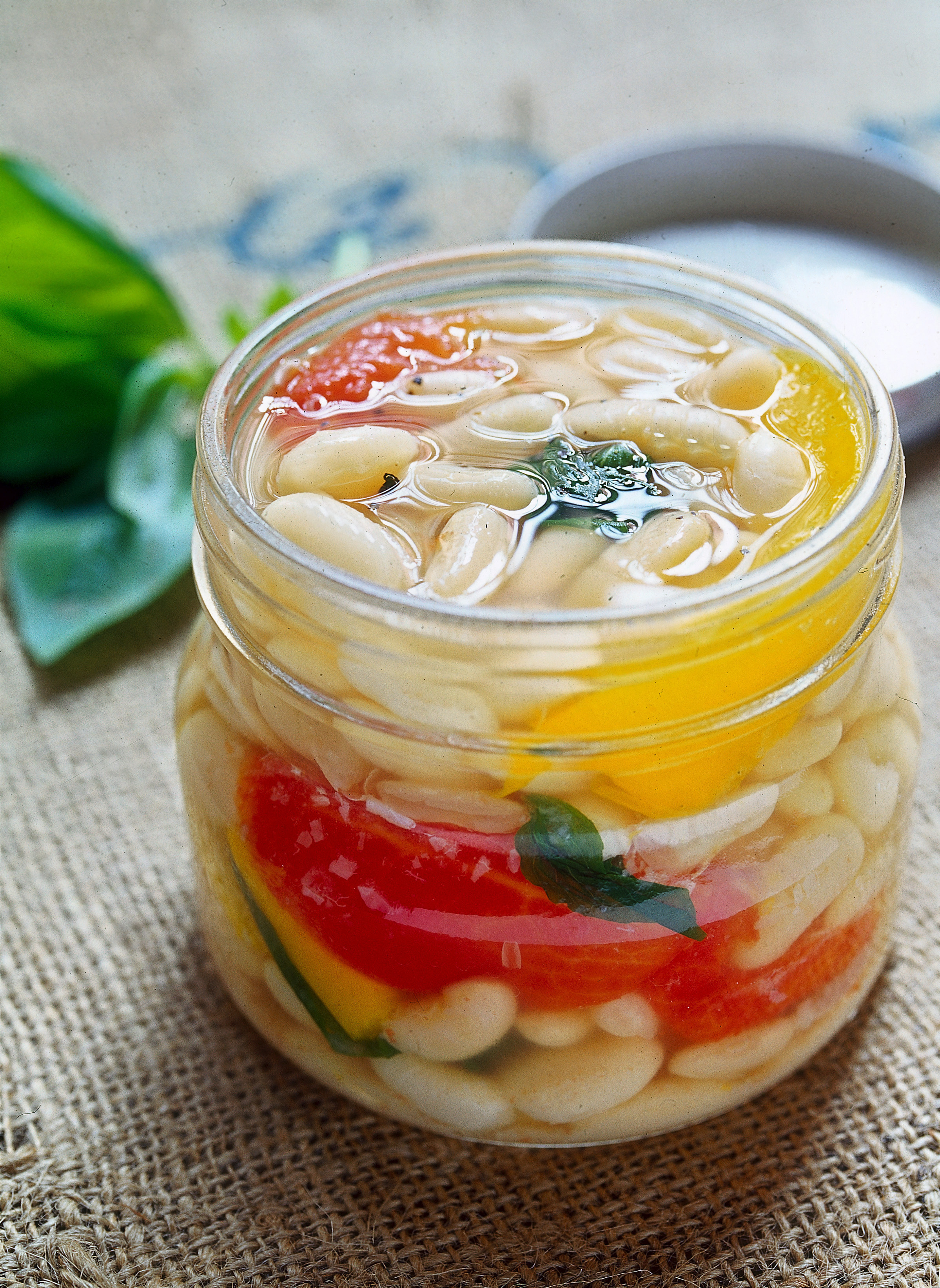 2) A questo punto sistema i fagioli in uno o 2 barattoli di vetro, alternandoli con i pomodori pelati a pezzetti, i peperoni, gli spicchi d'aglio affettati e il basilico; riempi i barattoli d'acqua, chiudili ermeticamente e riponili in una casseruola d'acqua fredda.