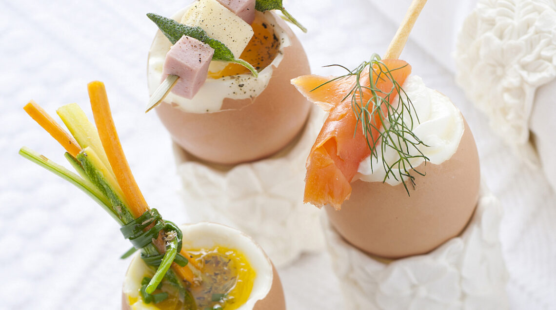 Una ricetta sfiziosa a base di uova alla coque farcite a piacere; potete sostituire il prosciutto cotto con salame, speck o mortadella, il salmone con carpaccio di branzino o tonno, la scamorza con Emmentaler o fontina, salvia e aneto con prezzemolo e dragoncello.