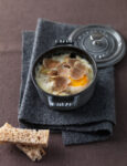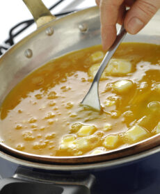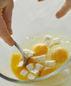 Sbatti le uova. Taglia il burro a dadini, riuniscilo in una ciotola con le uova, un pizzico di sale e una macinata di pepe e sbatti rapidamente le uova con una forchetta.